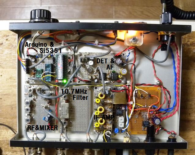 受信部は、第一中間周波数10.695MHz、第二中間周波数は455kHzと標準的。第一が10.695MHzとなっているのは、PLL基準が10.24MHzなので、455KHzにダウンコンバートするためこの周波数となっている。