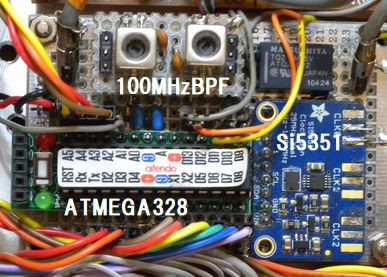 70MHzhDDSAD9851を使用している。このDDSクロックは10MHzのTCXOを基準としてVCXO30MHzを PLLを組み安定化し供給している。またVFO(Si5351)用のクロック25MHzも30MHzクロックのAD9851で作っている。455kHzキャリアは10MHz基準のAD9850から作り出している。これらはすべて固定周波数なのでArduino-nanoを使用しコントロールしている。10MHzは外部からGPS基準信号等が入力できるようにしている。詳細は下部回路図を参照願いたい。こだわりのOSCである。