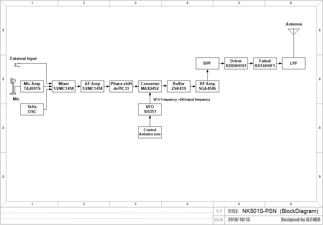 これも50MHzPSN送信機と同様MAX2452を使用している。特に調整回路がないのでキャリアバランス等の調整は行っていない。AFレベルを調整しても効果がなかった。何とか40dB程度である。他にも直交変調器のICはあるようだが、ほとんどがGHz用であり、HFに使えそうなものは見つからない。またDBMやスイッチを使ってディスクリートで組むこともできるが、回路規模が大きくなってしまう。その点MAX2452は外付け部品もなく簡単である。また運用してモニターしいただいているが、おおむね音質はよく、キャリア、逆サイド等は認められないとの評価をいただいている。この直交変調器にSi5351によるVFOを直接入力している。このVFOの周波数は運用周波数の2倍を入力している。50MHzであれば100MHzとなる。これで全バンド ダイレクトにSSBができる。